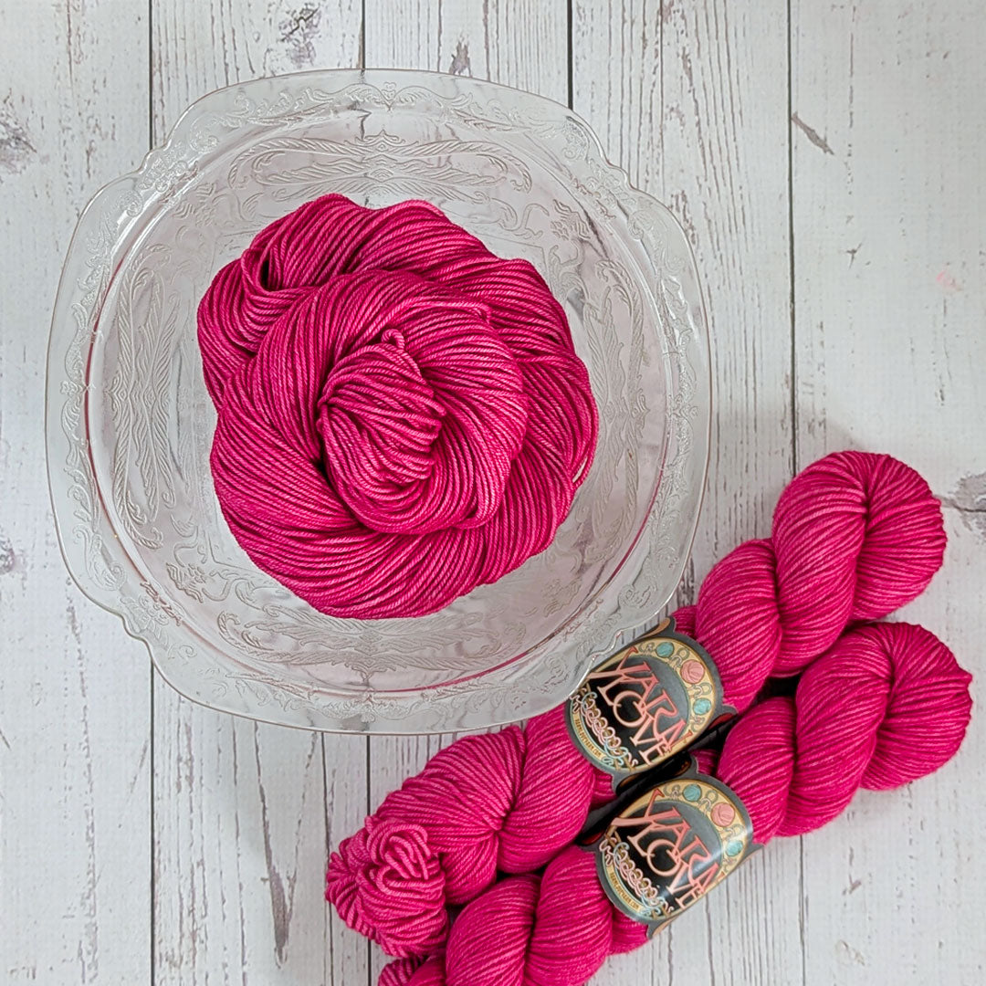 Haute Couture is a vibrant, hot pink hand-dyed yarn with subtle tonal depth. Nearly solid and bold, it’s perfect for standout projects.