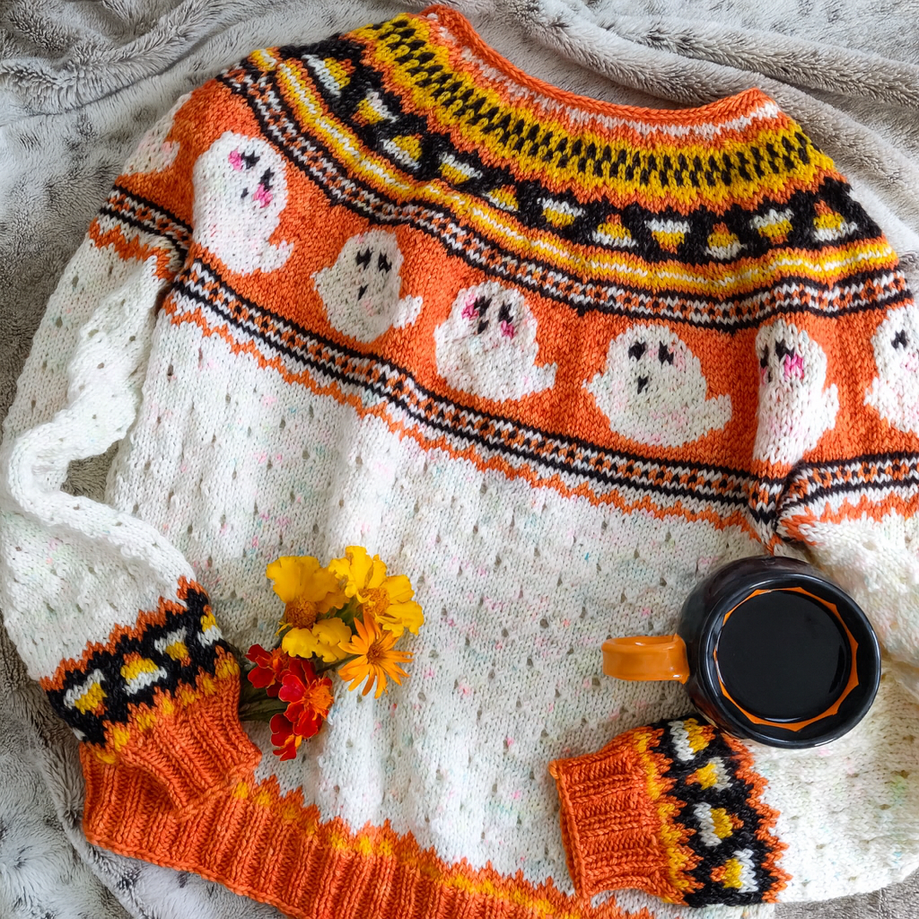 This circular yoke pullover sweater is knit from the top-down, and you can choose from 2 or 3 strand-at-a-time charts. The top and cuffs feature candy corn and happy ghosts in stranded colorwork/fair isle knitting. A simple eyelet pattern is used on the body of the sweater.