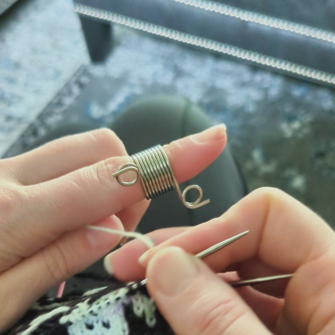 This clever ring slips onto the top of your finger & serves as a guide for two strands of yarn. It helps keep your tension even and stranded colorwork stitches will fly off your knitting needles.