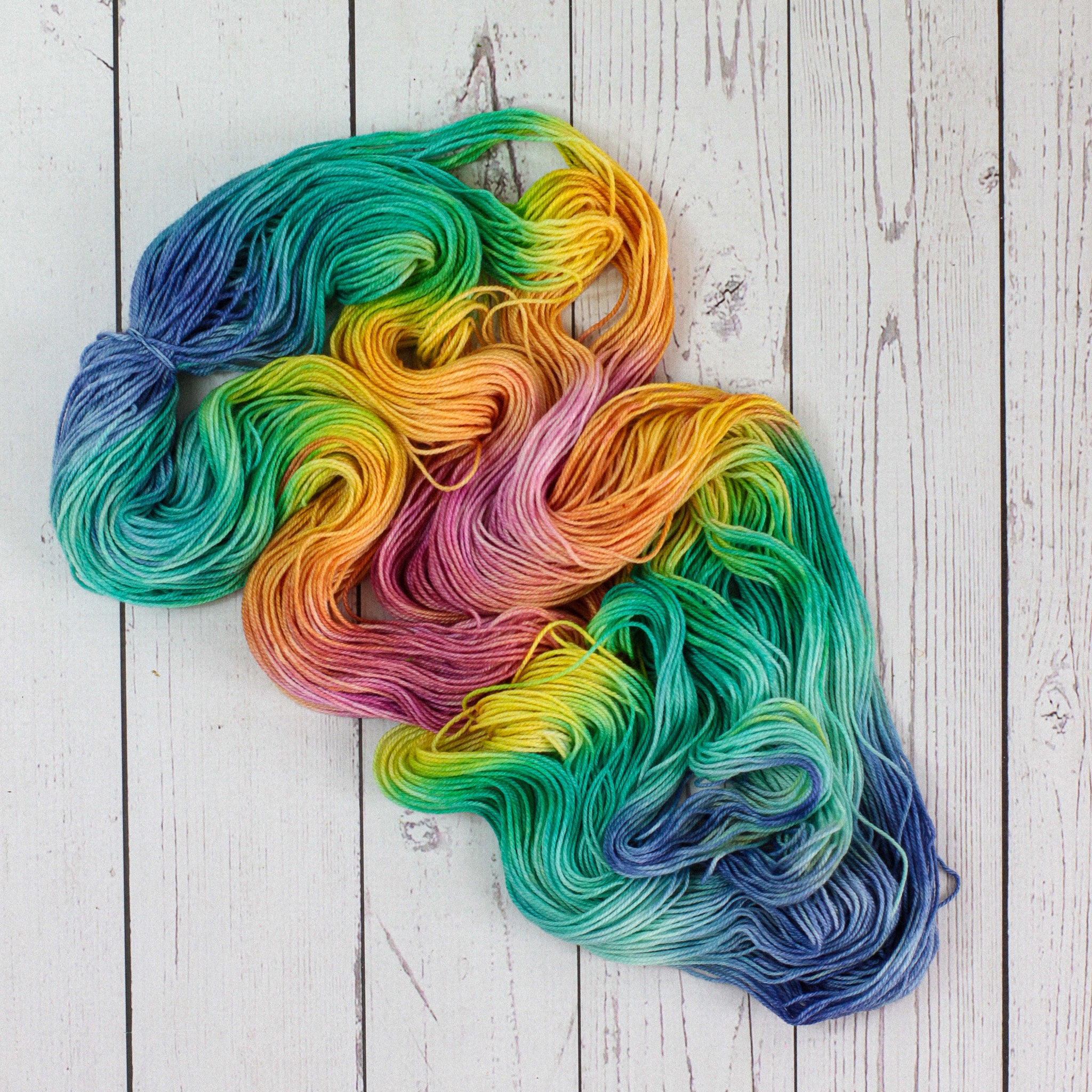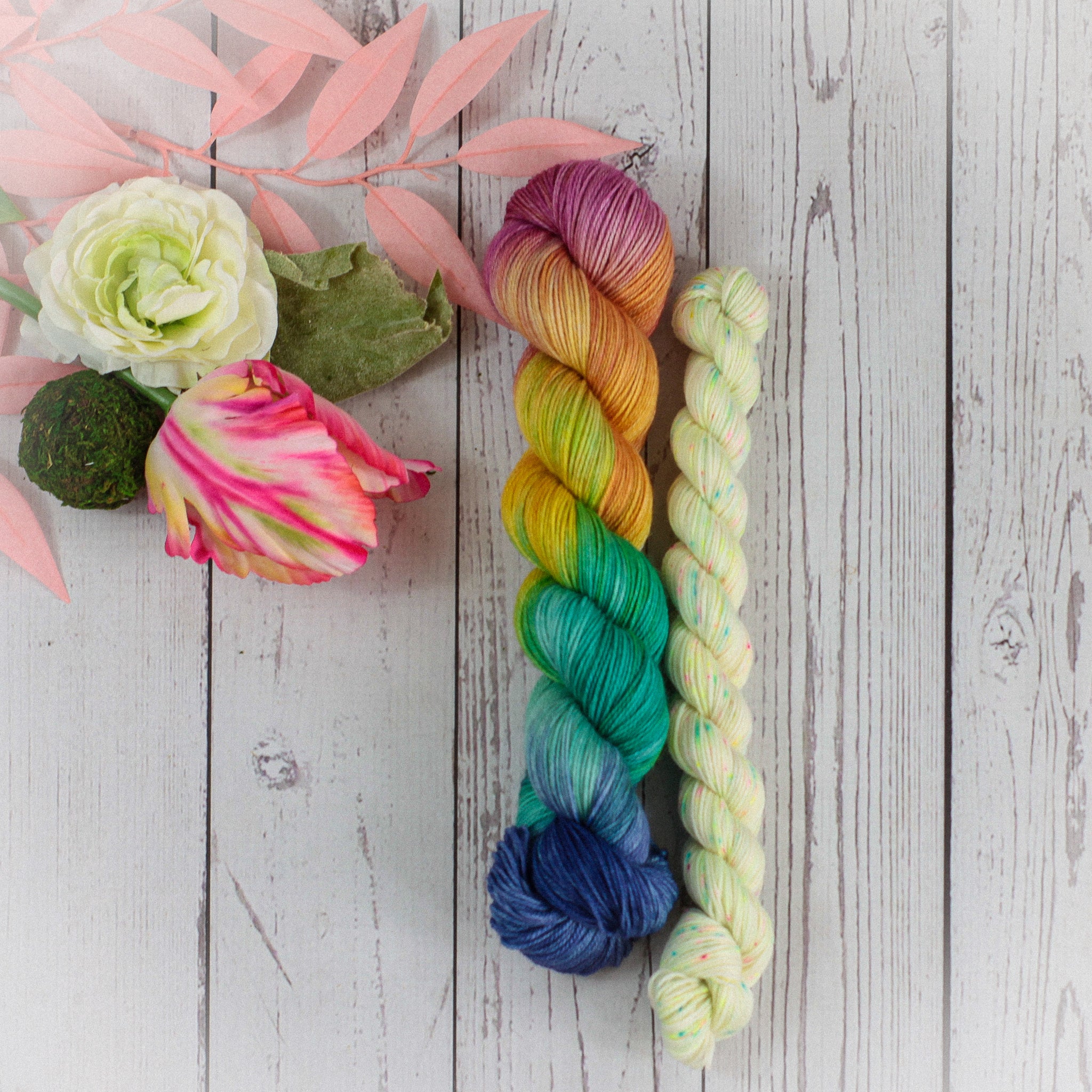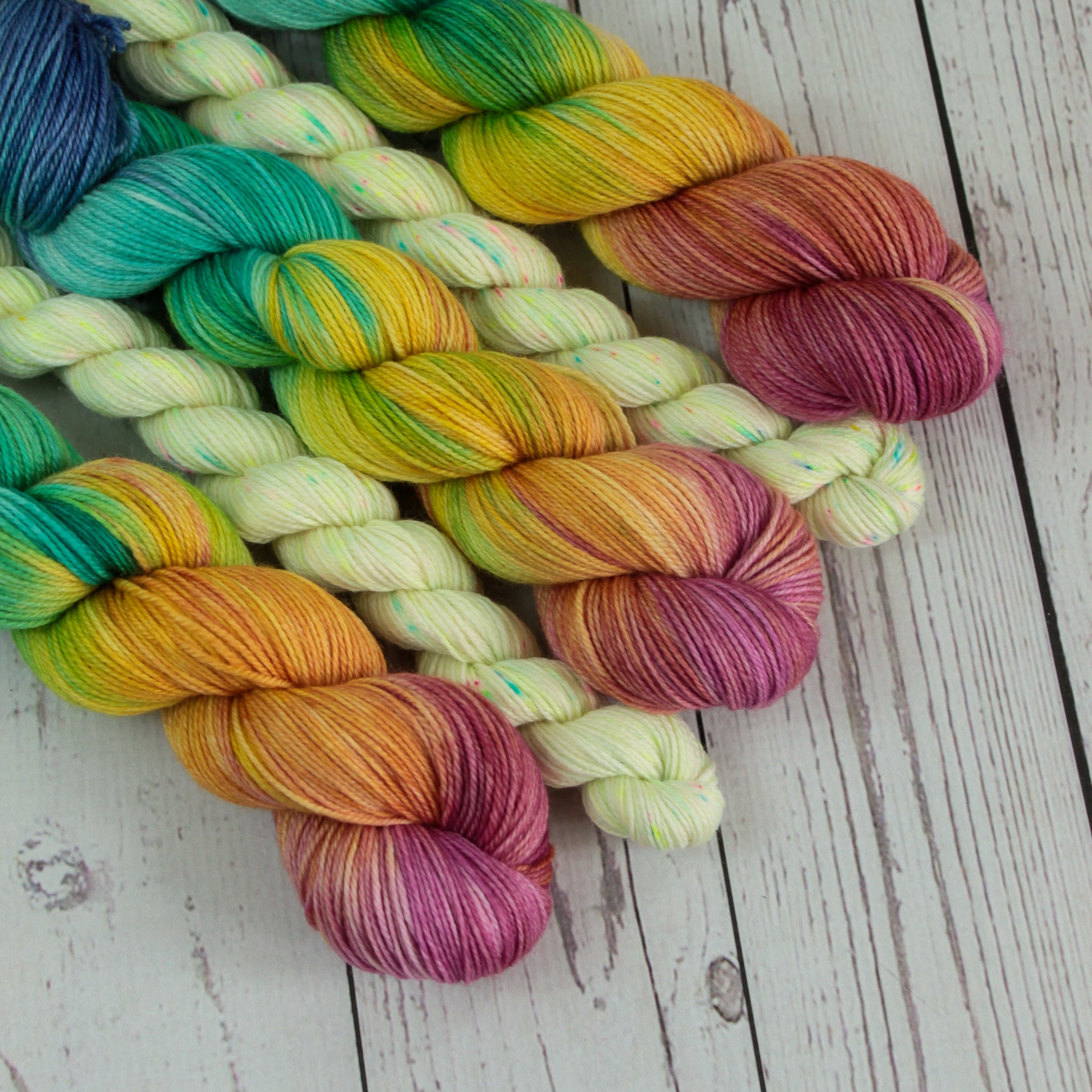 A beautiful jewel-toned colorway - kettle dyed so every skein is unique. Bright pink, deep rose, royal purple, golden yellow, peach with pops of aqua.