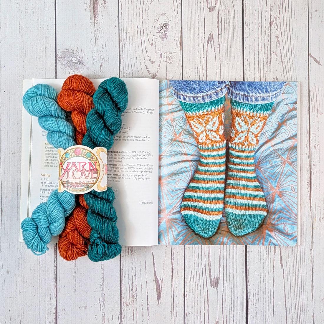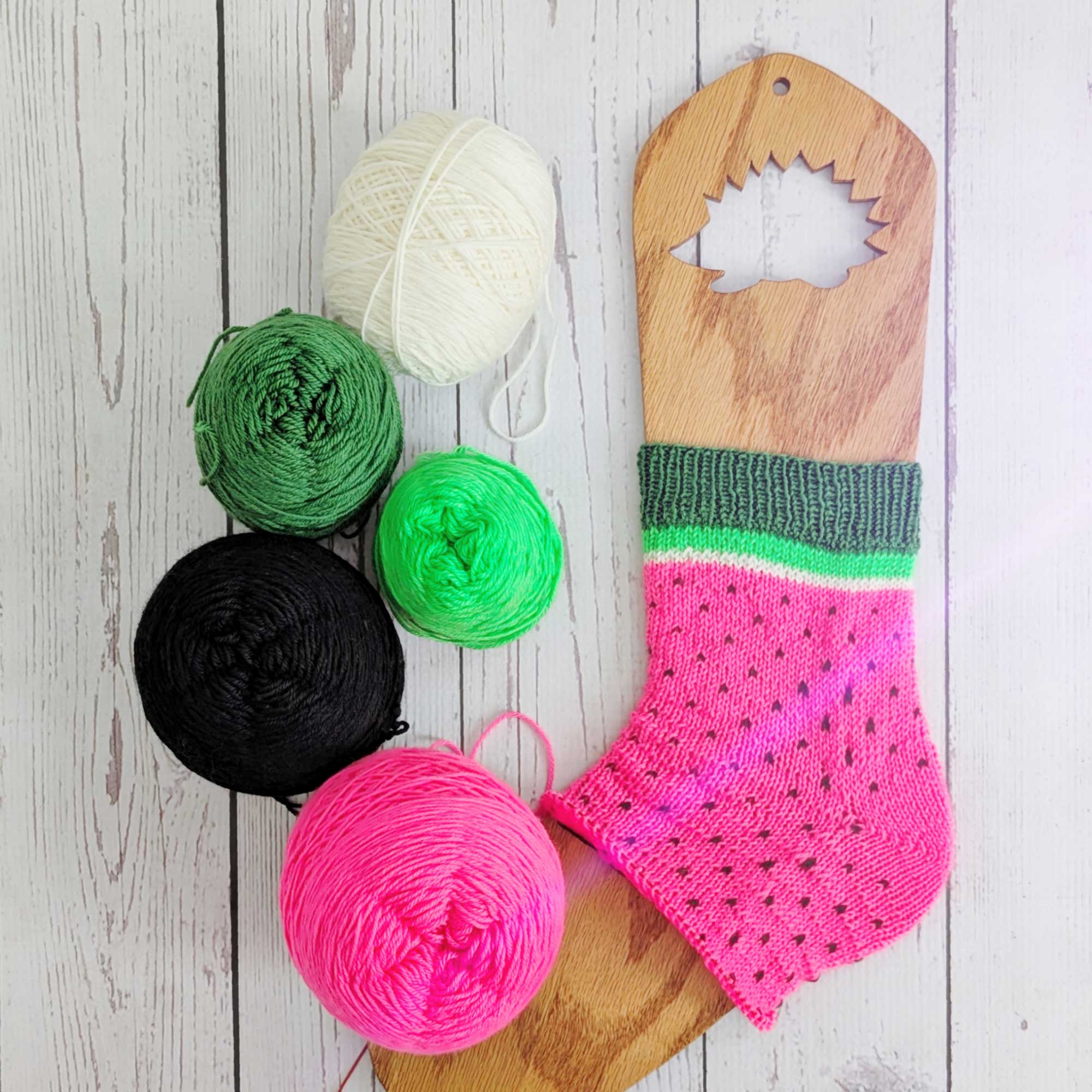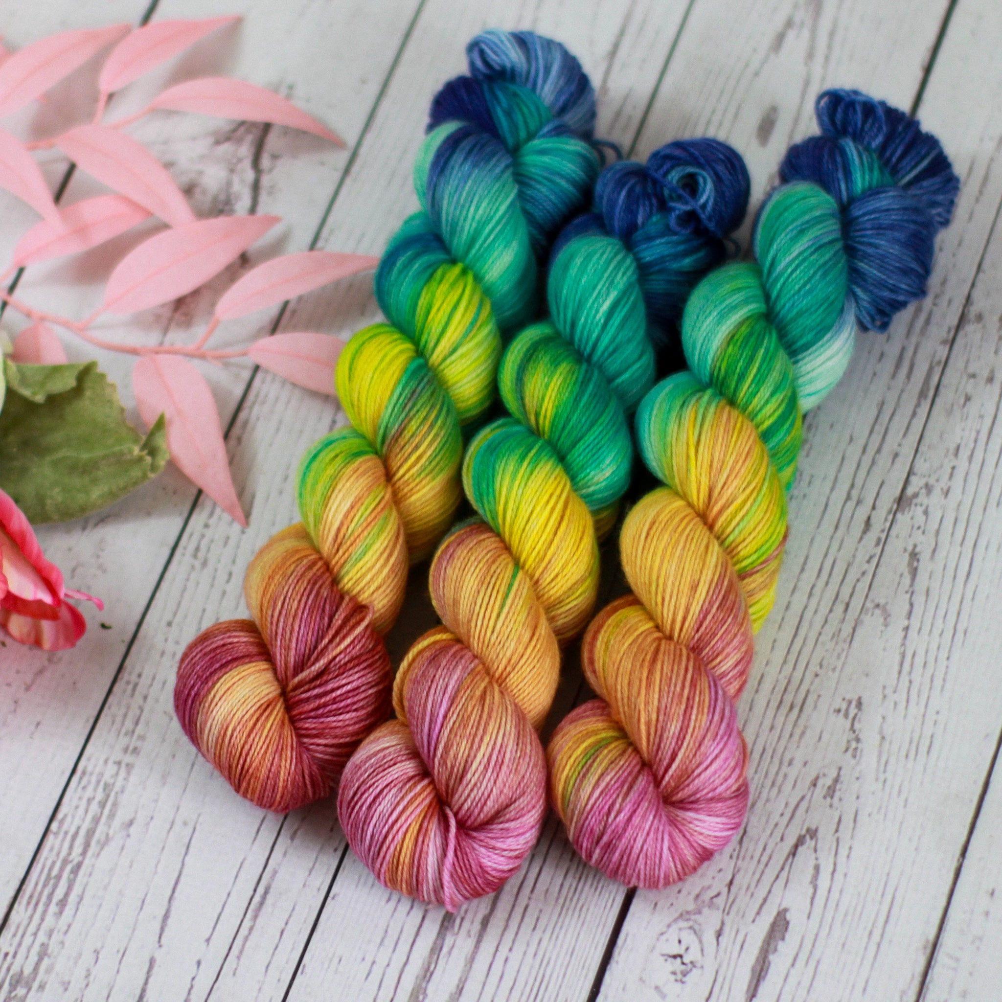 A beautiful jewel-toned colorway - kettle dyed so every skein is unique. Bright pink, deep rose, royal purple, golden yellow, peach with pops of aqua.